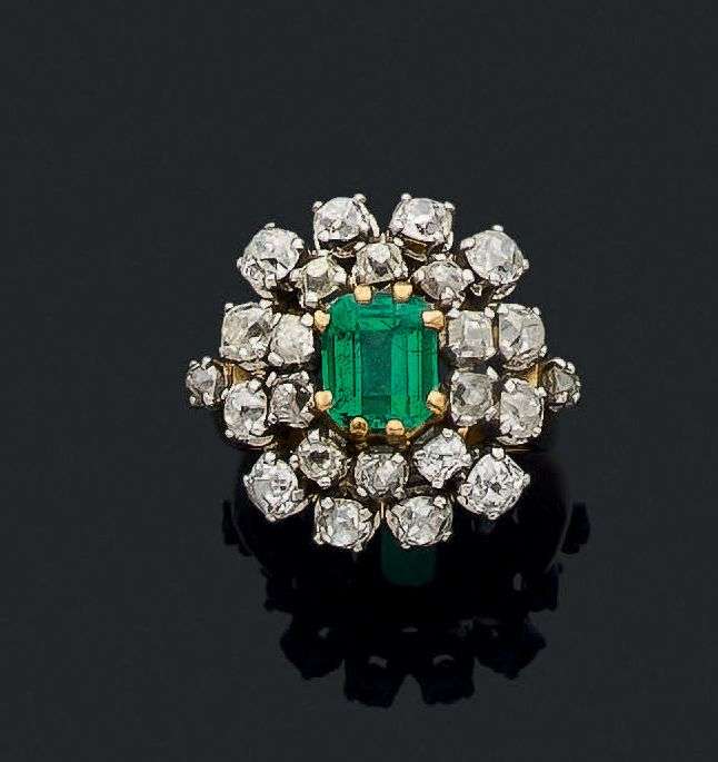 Émeraude rectangulaire à pans coupés et diamants taille ancienne