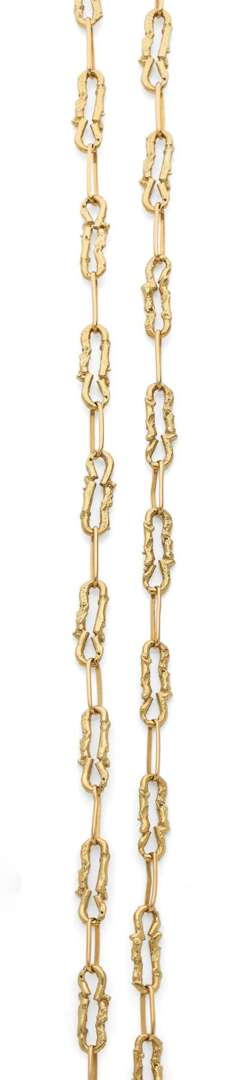 A gold long necklace, stamped