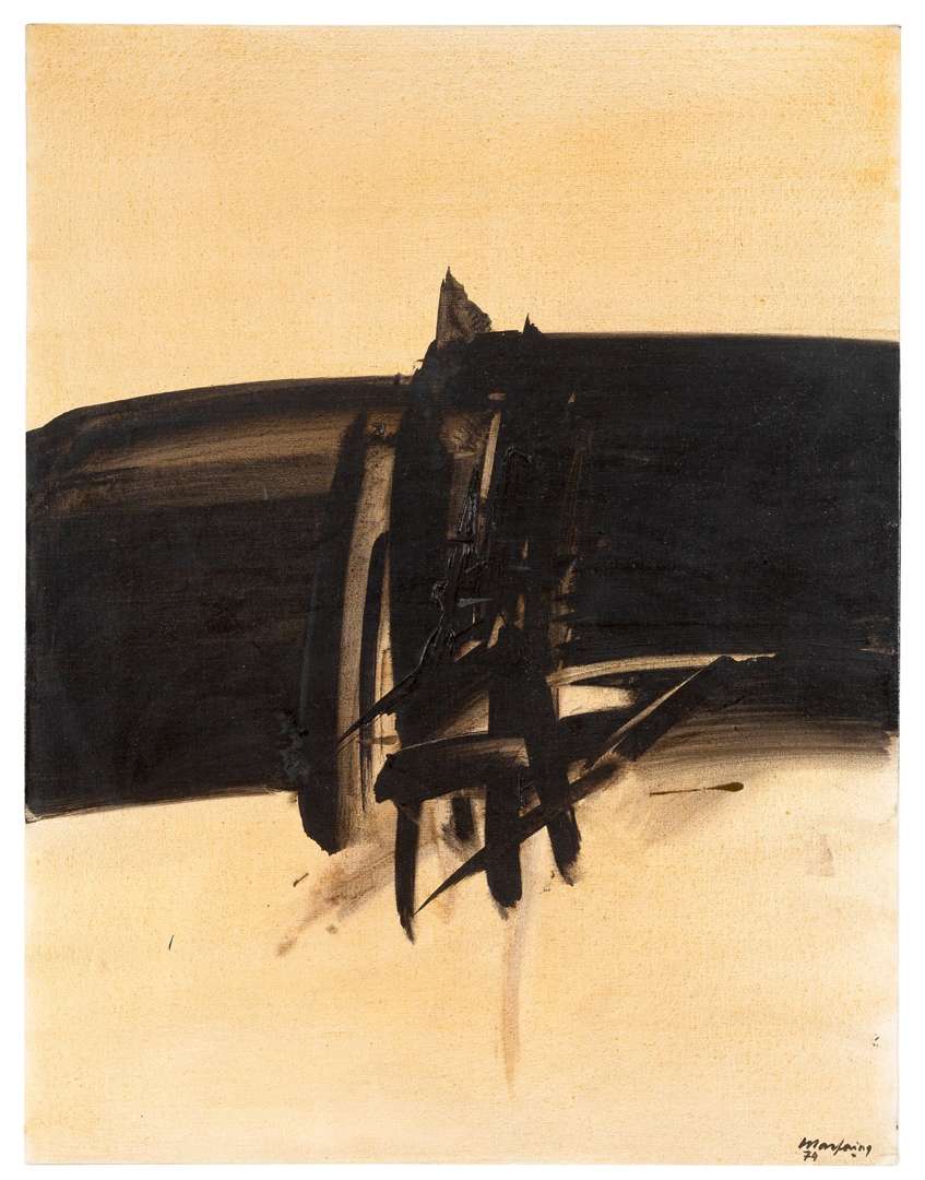Marfaing opte ici pour un jeu subtil d'ombres et de lumières, créant une tension visuelle saisissante. L'ocre et le noir se mêlent de manière magistrale, évoquant un dialogue entre la chaleur de la couleur et la profondeur de l'obscurité. En contemplant cette pièce, on ne peut s'empêcher de ressentir l'influence spirituelle qui imprègne l'ensemble de l'oeuvre de Marfaing. Chaque coup de pinceau semble être une méditation, une exploration constante du conflit entre l'ombre et la lumière, du néant à l'être. Cette Composition de 1974 témoigne non seulement de l'habileté technique de l'artiste mais également de sa capacité à atteindre un équilibre parfait où la tension du trait répond à l'écriture stable des volumes.