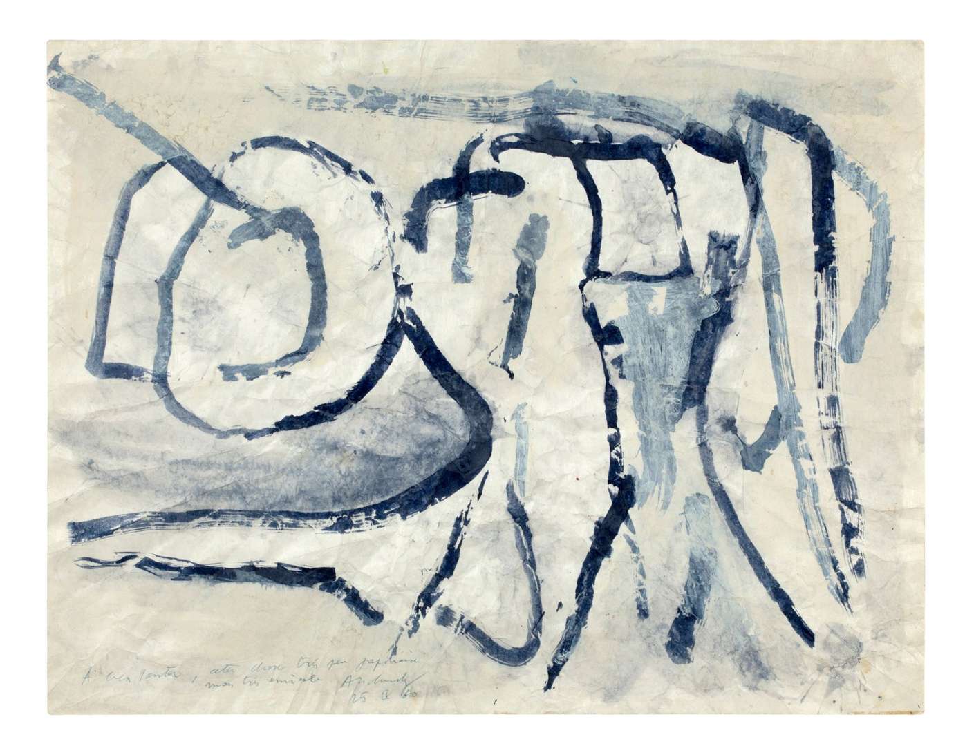 Aquarelle et gouache sur papier froissé, signée et portant une dédicace datée de 1960 en bas à gauche