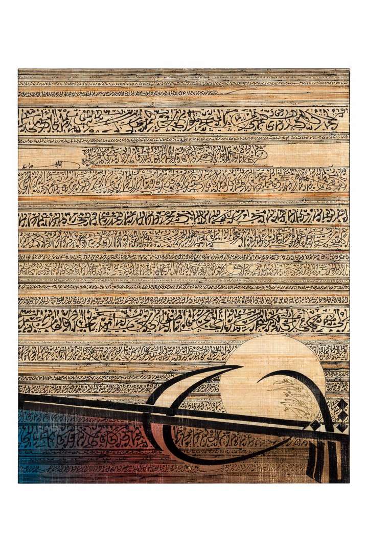 Encre de chine et acrylique sur papyrus signée en haut à gauche, contresignée et datée au dos