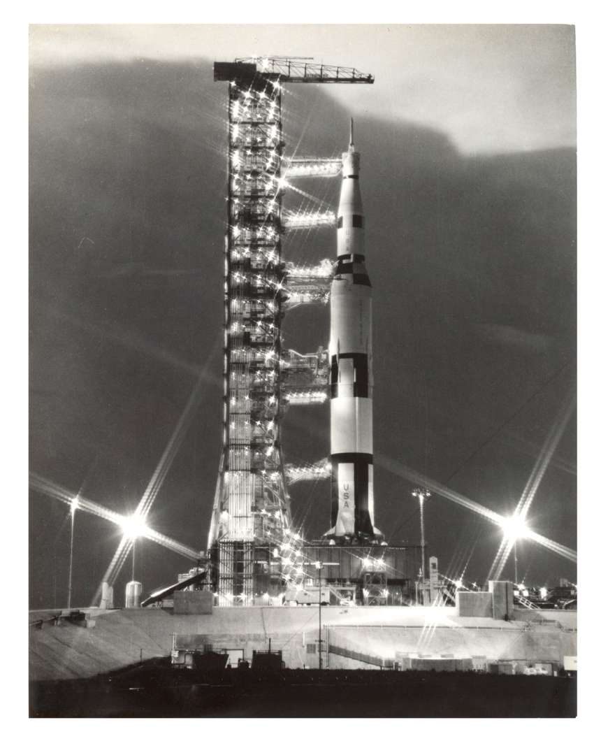 Fusée sur la rampe de lancement (attribuée à Saturne V)