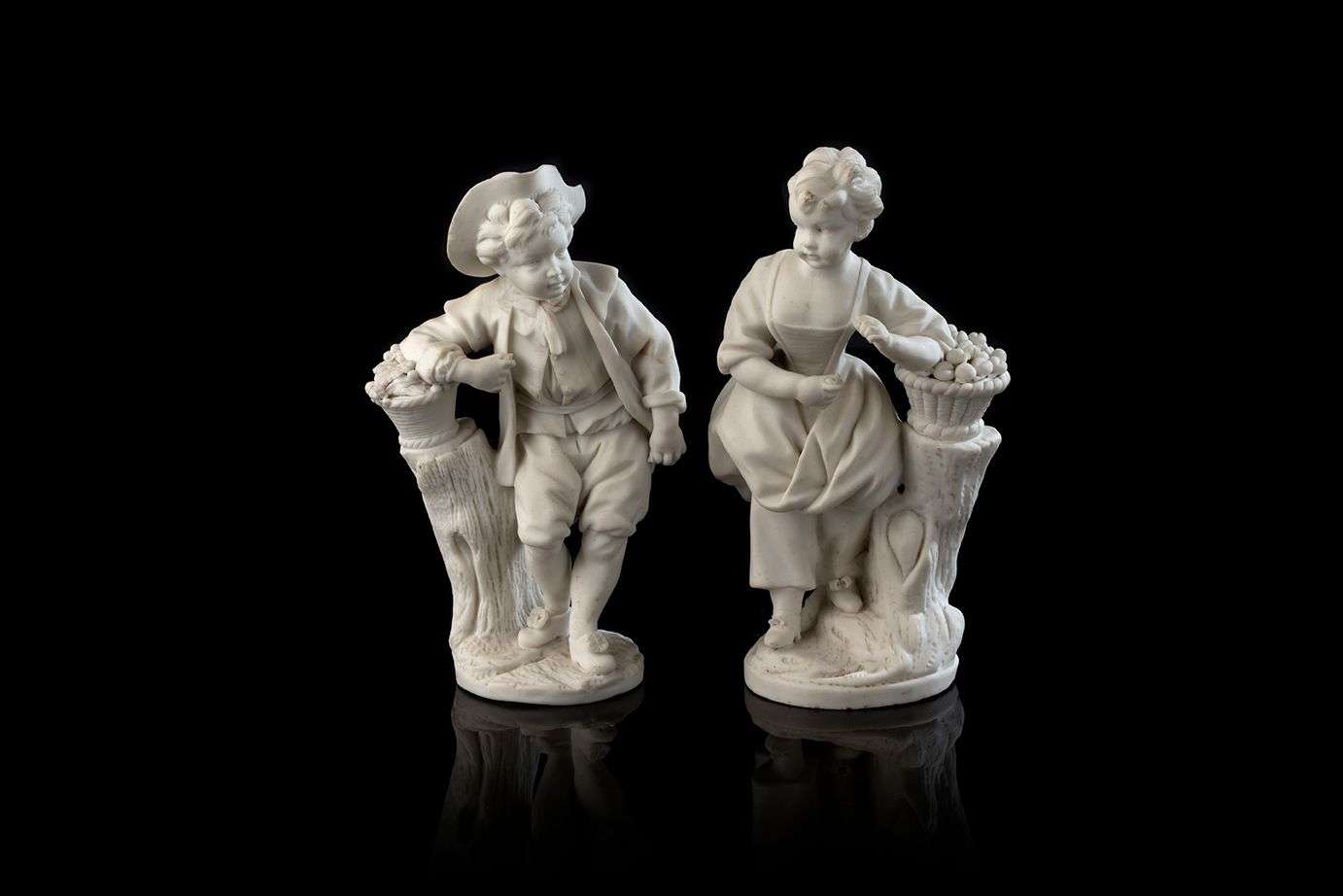 Deux petits sujets en biscuit de porcelaine représentant un petit vendangeur et une petite maraîchère s'accoudant chacun à une corbeille de fruits. Probablement d'après Falconnet.