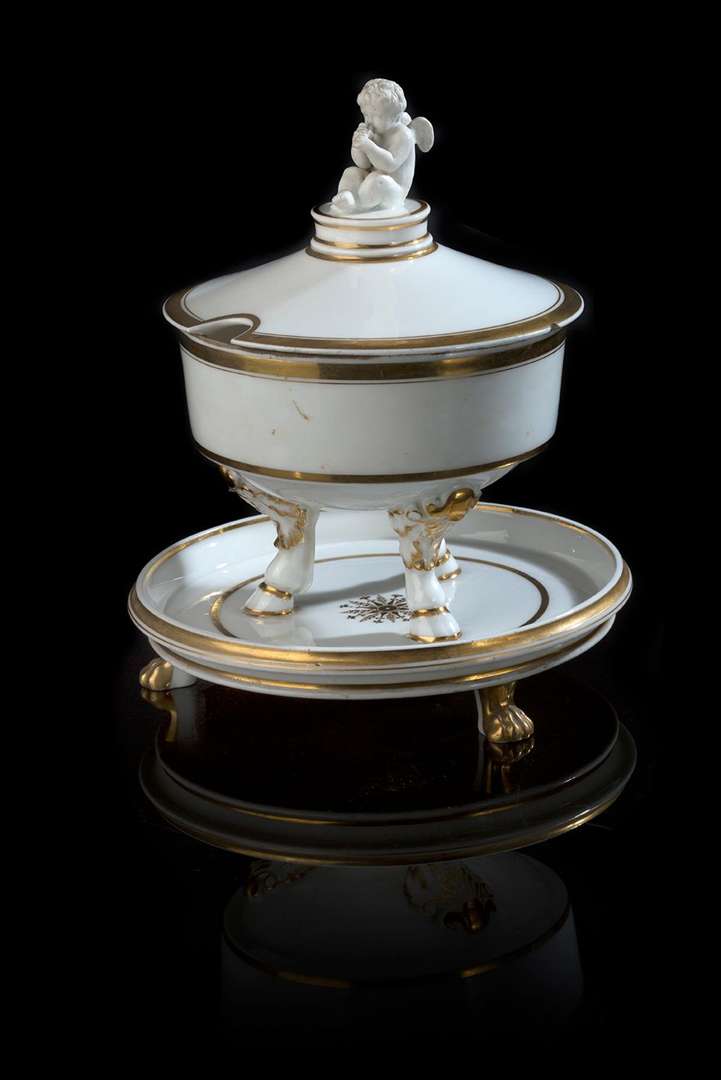 CONFITURIER tripode en porcelaine blanche et à réhauts dorés.