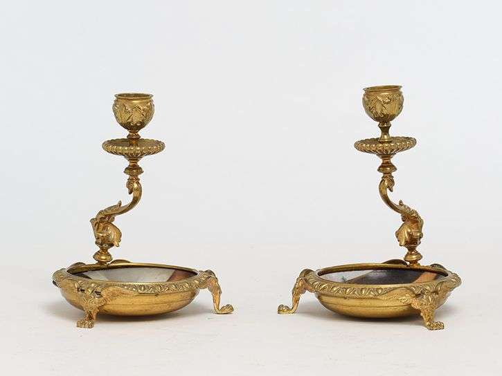 Paire de bougeoirs en bronze doré, les coupelles en porcelaine à décor émaillé poychrome de scènes de vie villageoise.~