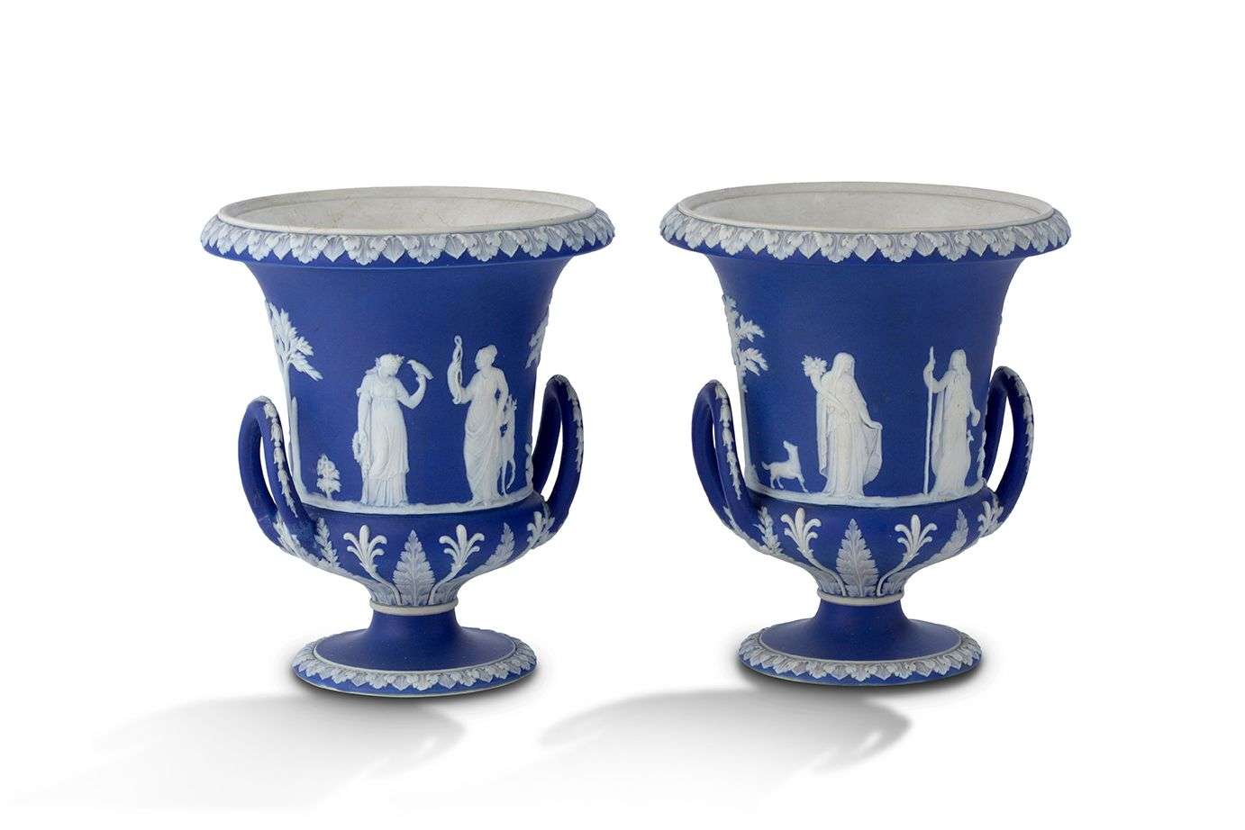Paire de vases de forme Médicis en biscuit de porcelaine pâte sur pâte bleu et blanc à décor à l'antique.