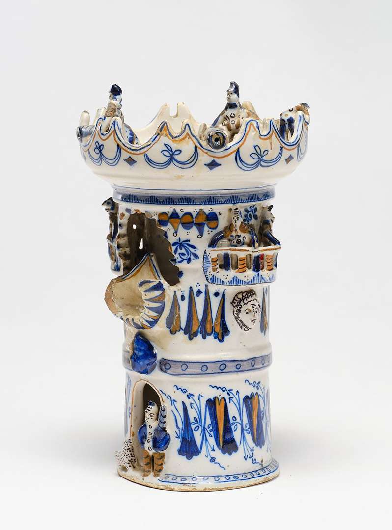en faïence à décor émaillé blanc et bleu en forme de tour fortifiée et gardée.