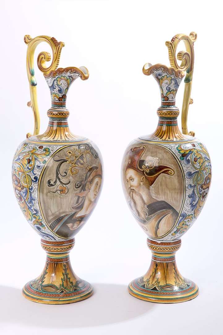 en faïence polychrome à décor de grotesques. Les panses ornées respectivement d'un portrait inséré dans un cartouche ovale.