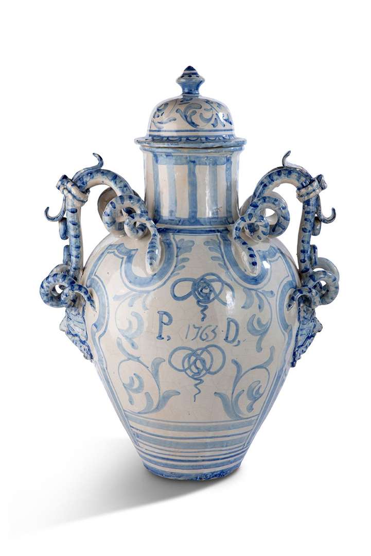 Potiche couverte en faïence bleue et blanc à décor d'une scène antique inscrite dans un cartouche feuillagé