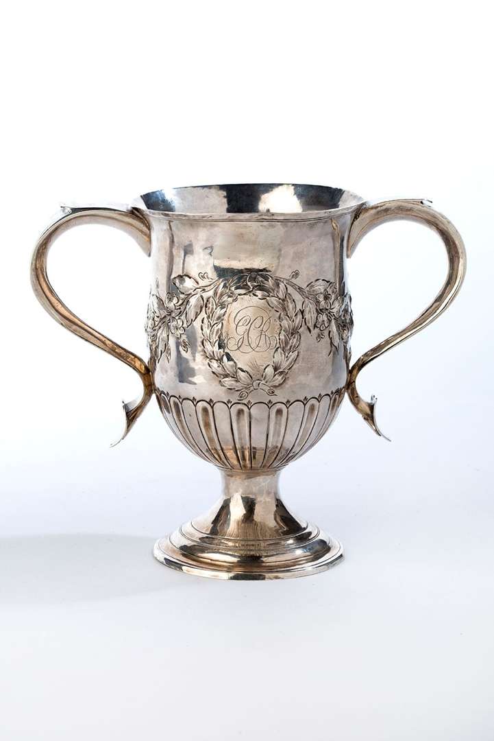 La panse à décor au repoussé d'une guirlande fleurie. L'avers est gravé des intiales GCR, insérées dans une couronne de lauriers. Les anses creuses se