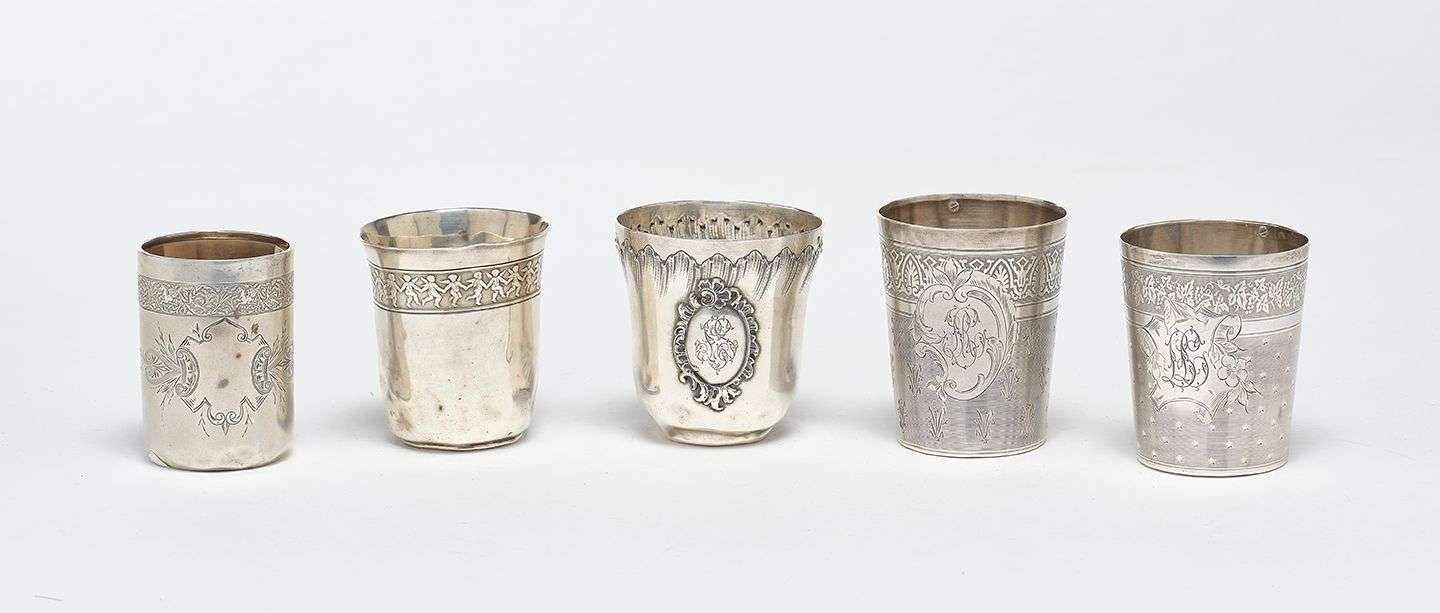 LOT DE CINQ TIMBALES en argent. Décor gravé.