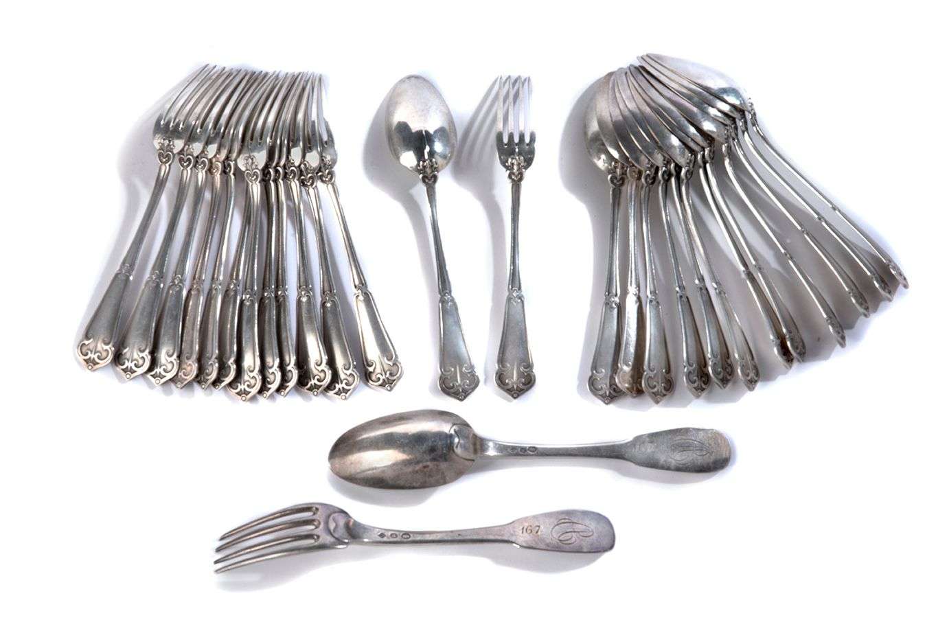 fourchettes et cuillères, en argent à modèle piriforme à queue de rat.