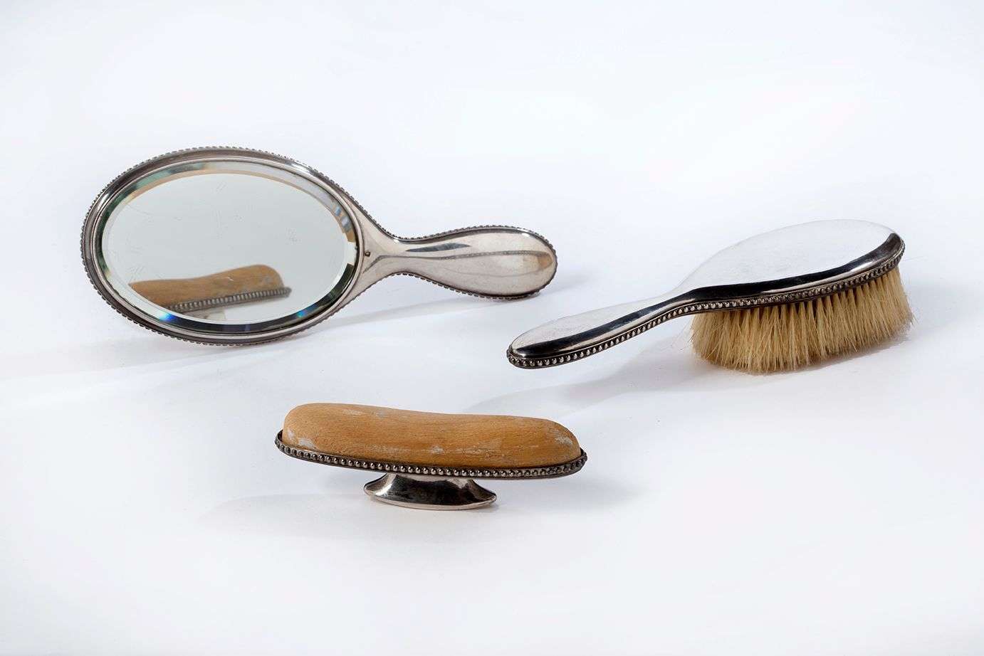 en métal argenté comprenant une brosse, un miroir et d'une monture de brosse.