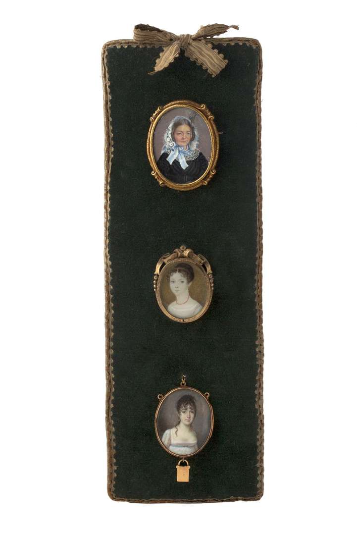 - une miniature portrait d'une femme en robe blanche et ceinture bleue. Monture en or jaune en médaillon, cadenas en pendeloque, cheveux au revers. Epoque Empire. Hauteur : 6,5 cm