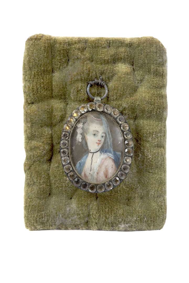 au portrait de courtisane vêtue d'une robe rose et d'une cape bleue.