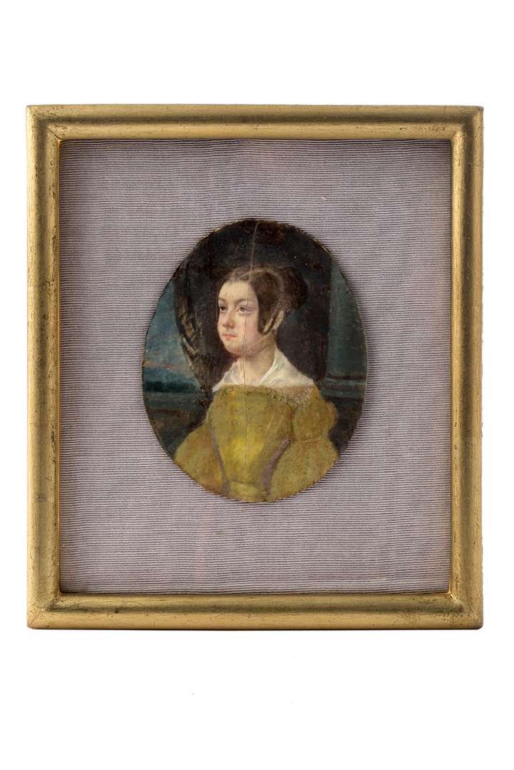 PORTRAIT MINIATURE de forme ovale représentant une jeune fille posant en buste de 3/4. Elle est vêtue d'une robe jaune et d'un châle blanc sur les épaules, ses cheveux sont attachés en chignon.