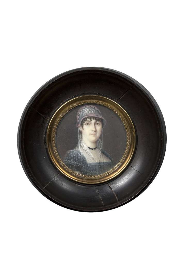 PORTRAIT MINIATURE circulaire représentant une femme en buste de 3/4 et vê