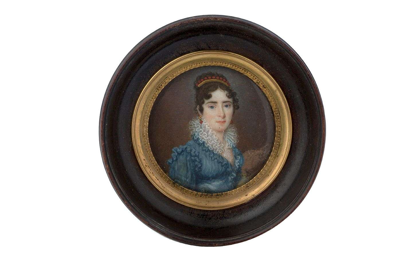 PORTRAIT MINIATURE circulaire représentant une élégante à la robe bleue représentée en buste de trois-quart, elle porte une parure de corail.