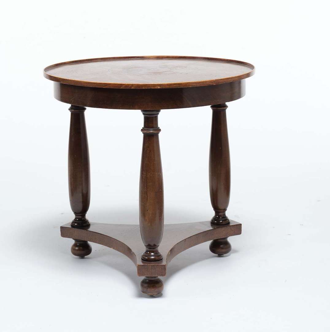 en bois laissé au naturel. Le plateau circulaire à rebord. Piètement à trois colonnes reliées par une tablette d'entretoise.