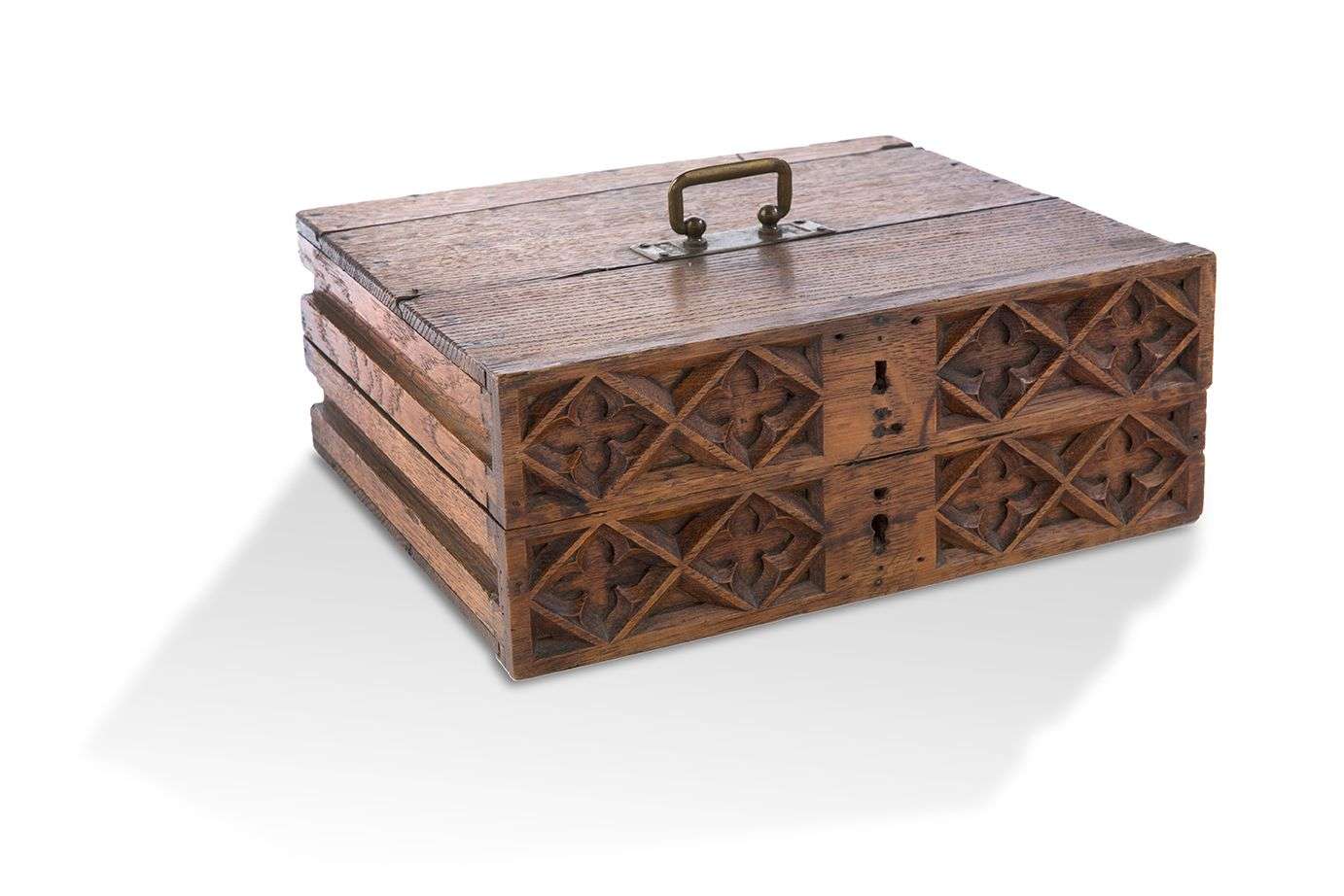COFFRET-NECESSAIRE en chêne sculpté ouvrant en portefeuille. La façade à décor de quadrilobes gothiques en fenestrage à orbevoie. Cet objet est le réemploi de deux tiroirs de meuble. Poignée supérieur rapportée.