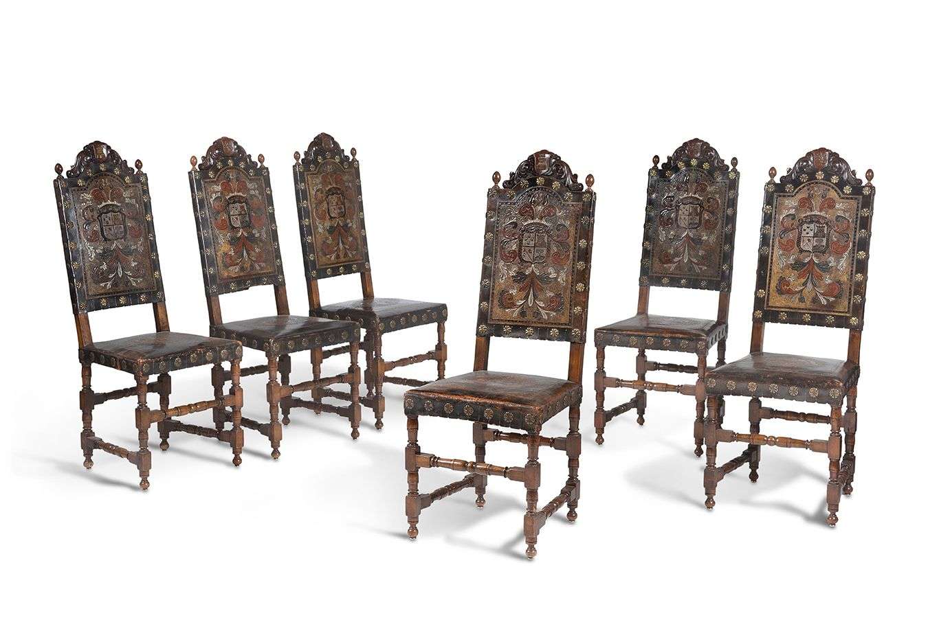 en bois et cuir gaufré à décor estampé et polychrome. Les assises ornées d'une fleur de lys et les dossiers ornés d'armoiries.