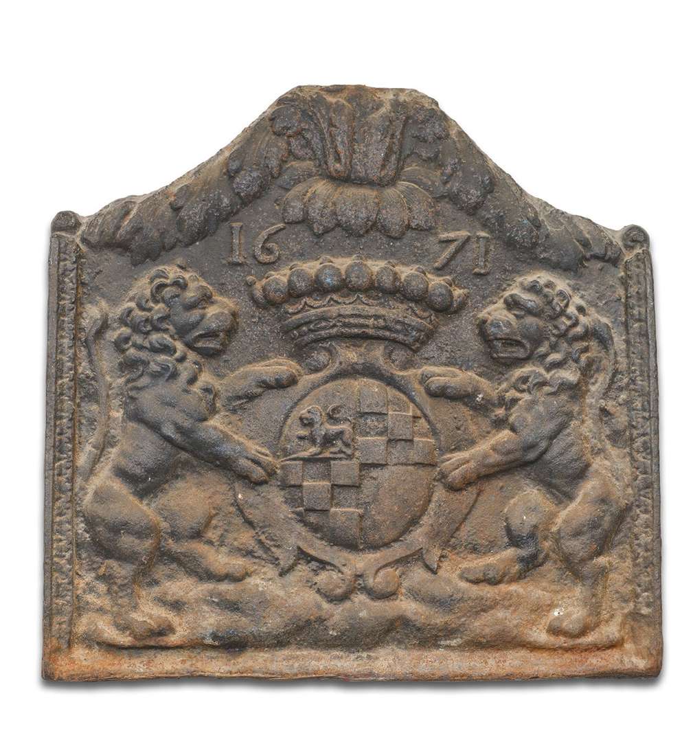 en fonte de fer décorée en léger relief de deux lions rempants encadrant des armoiries écartelées sous une couronne comtale.