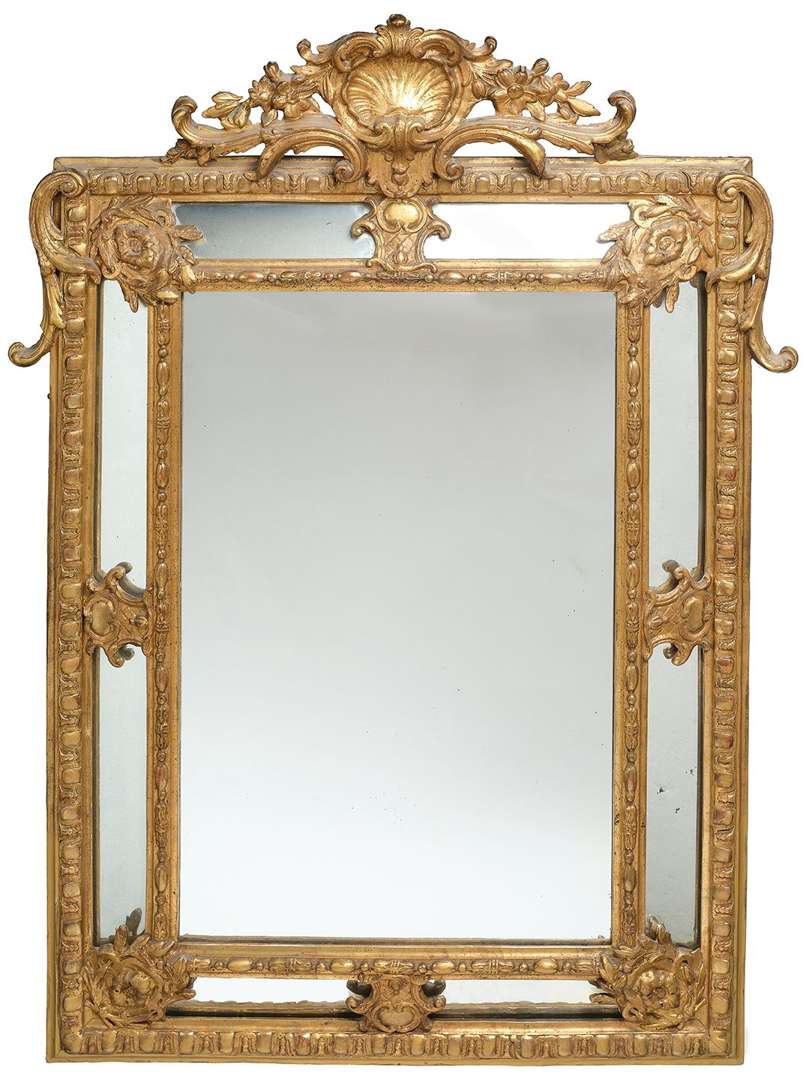 en bois et stuc doré de forme rectangulaire à décor de volutes et médaillons fleuris. Le fronton orné d'une coquille.