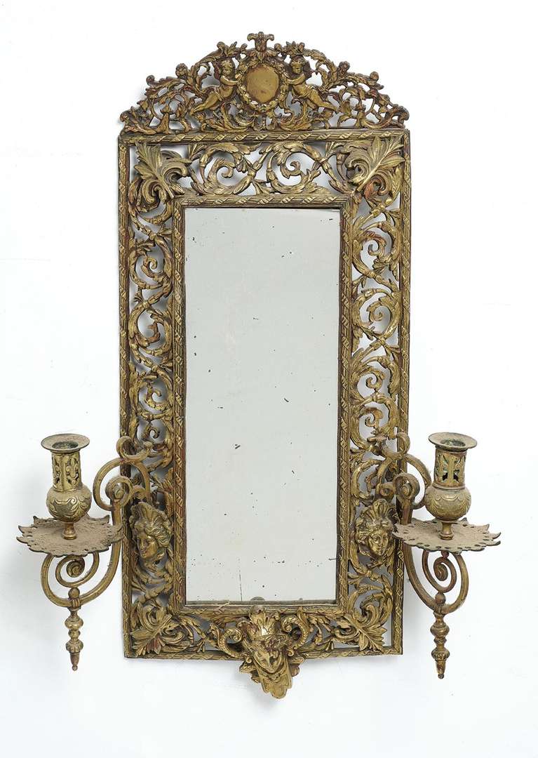 le cadre en laiton doré à décor ajouré de rinceaux, présente deux bras de lumières.