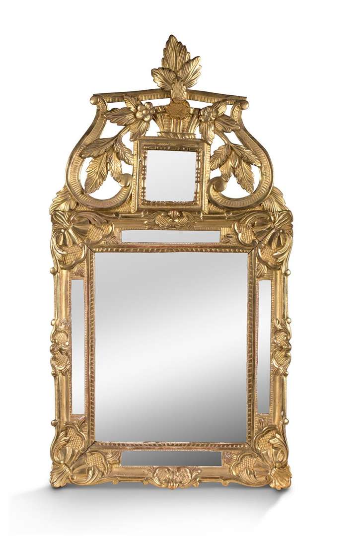 en bois sculpté et doré. Le fronton à décor ajouré orné d'une glace flanquée de deux volutes et sommée d'une corbeille feuillagée.