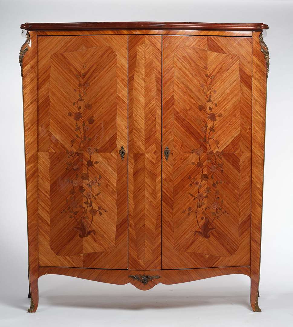 En bois et bois de placage de forme mouvementée. La façade ouvrant par deux vantaux à décor marqueté de fleurs.