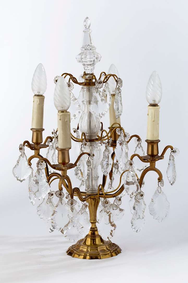 à pendeloques en verre taillé. Le fût en verre taillé à quatre feux.