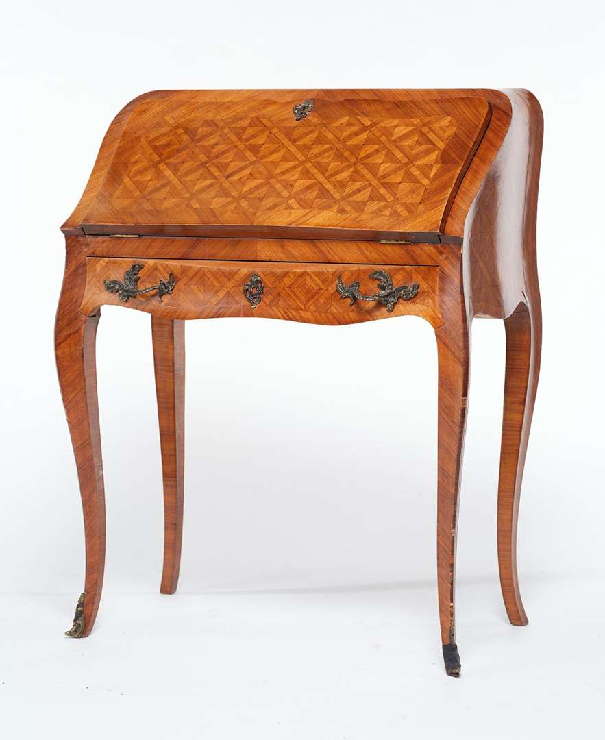 En bois de placage à décor marqueté géométrique. L'abattant découvrant un intérieur à quatre compartiments et quatre tiroirs.