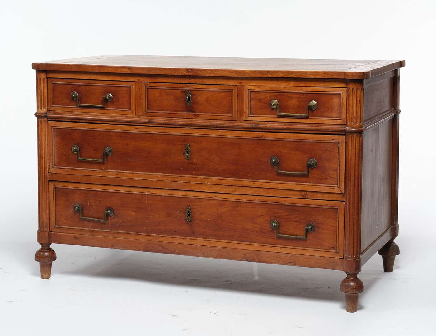 en bois laissé au naturel, la façade ouvrant par cinq tiroirs sur trois rangées. Les montants avants arrondis et cannelés se terminant par des pieds en toupie.