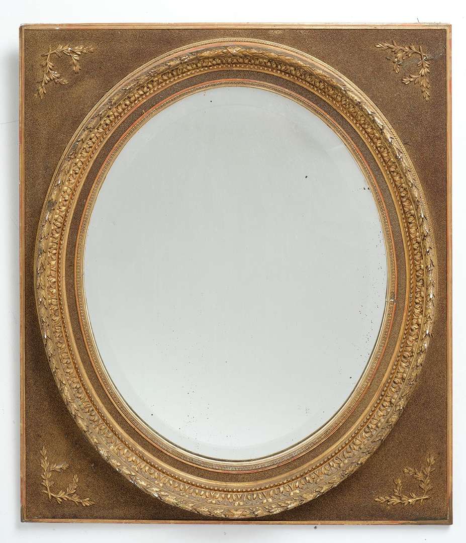 en bois sculpté et doré de forme ovale. L'encadrement en couronne de lauriers est fixé sur un panneau de forme rectanglaire.