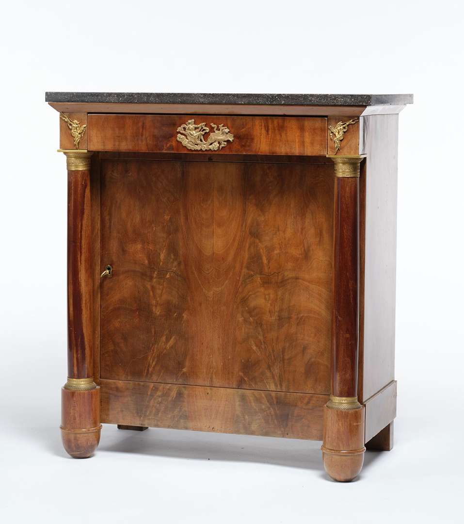 En bois et placage d'acajou. La ceinture ouvrant par un tiroir. La façade ouvrant par un vantail.