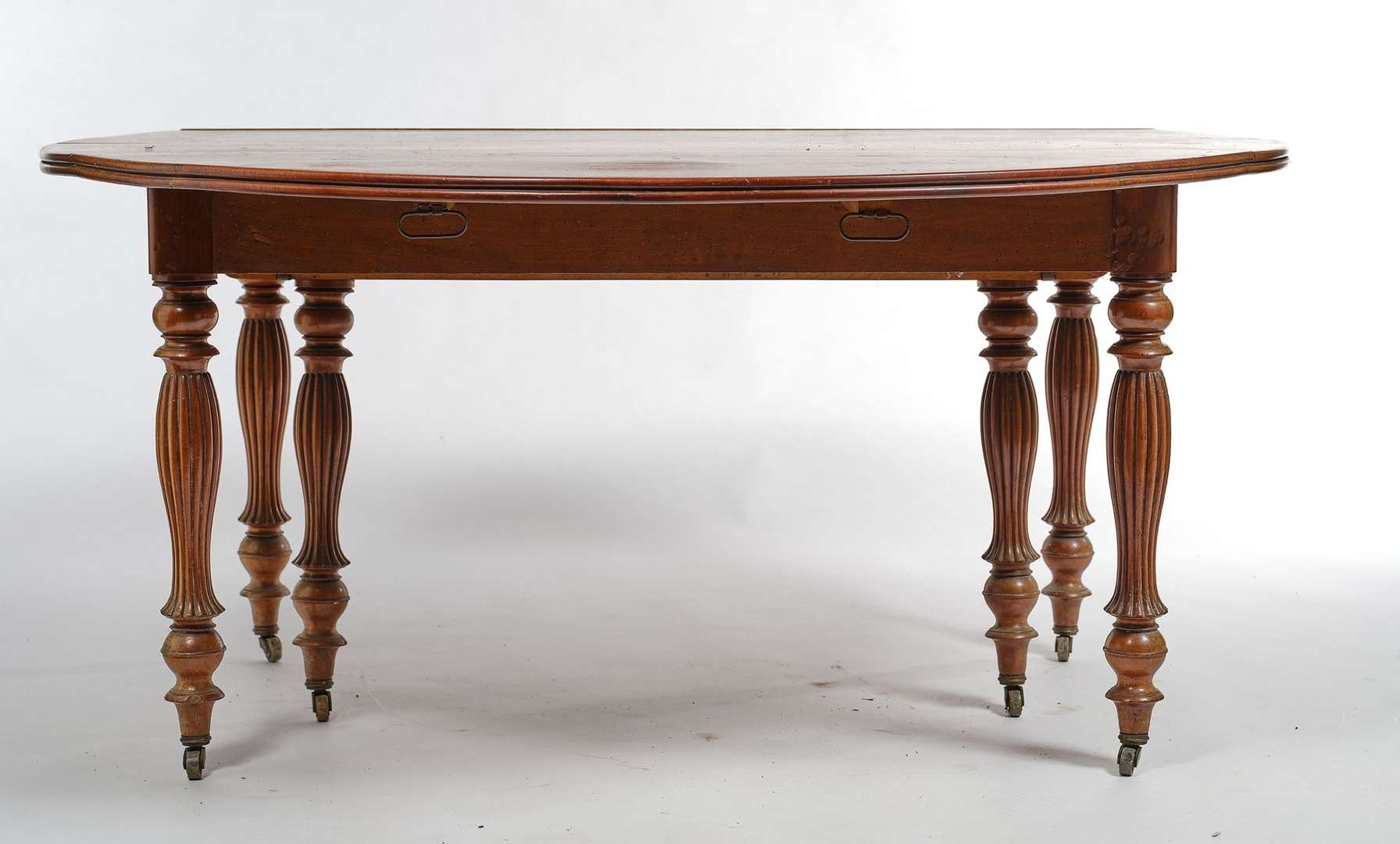 en bois. Le plateau de forme ovale à deux volets. Repose sur six pieds tournés en balustre se terminant par des roulettes.