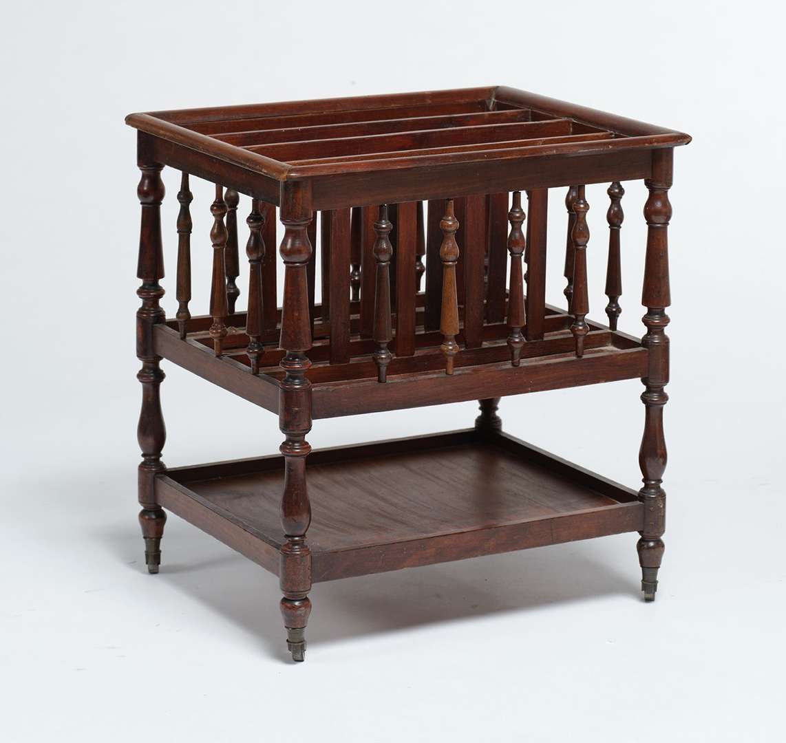 de bois comportant quatre rangées en partie supérieure et une entretoise en partie inférieure. Les pieds se terminant par des roulettes.