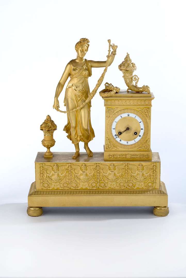 en bronze doré représentant une jeune femme vêtue à l'antique et jouant avec une guirlande feurie.