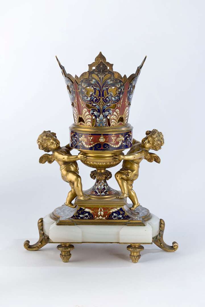 Base de vase en bronze doré à décor d’émaux cloisonnés dans un entourage de rubans fleuris. La panse ajourée en forme de couronnée fleurdelysée est soutenue par deux putti.