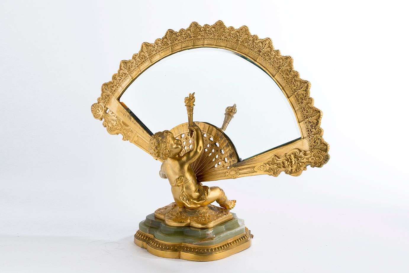 en forme d'éventail déplié et tenu par un putto cérophéraire en bronze ciselé et doré.