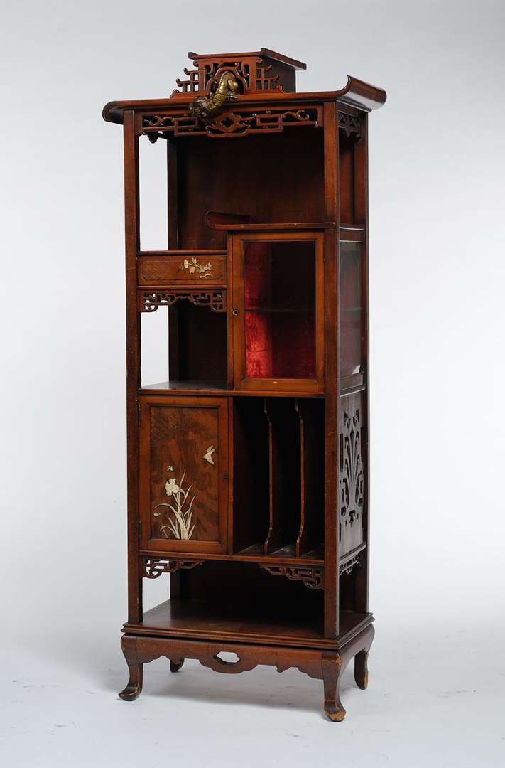 et présentoir à différents rangements de style asiatique et surmonté d'un dragon de bronze doré.