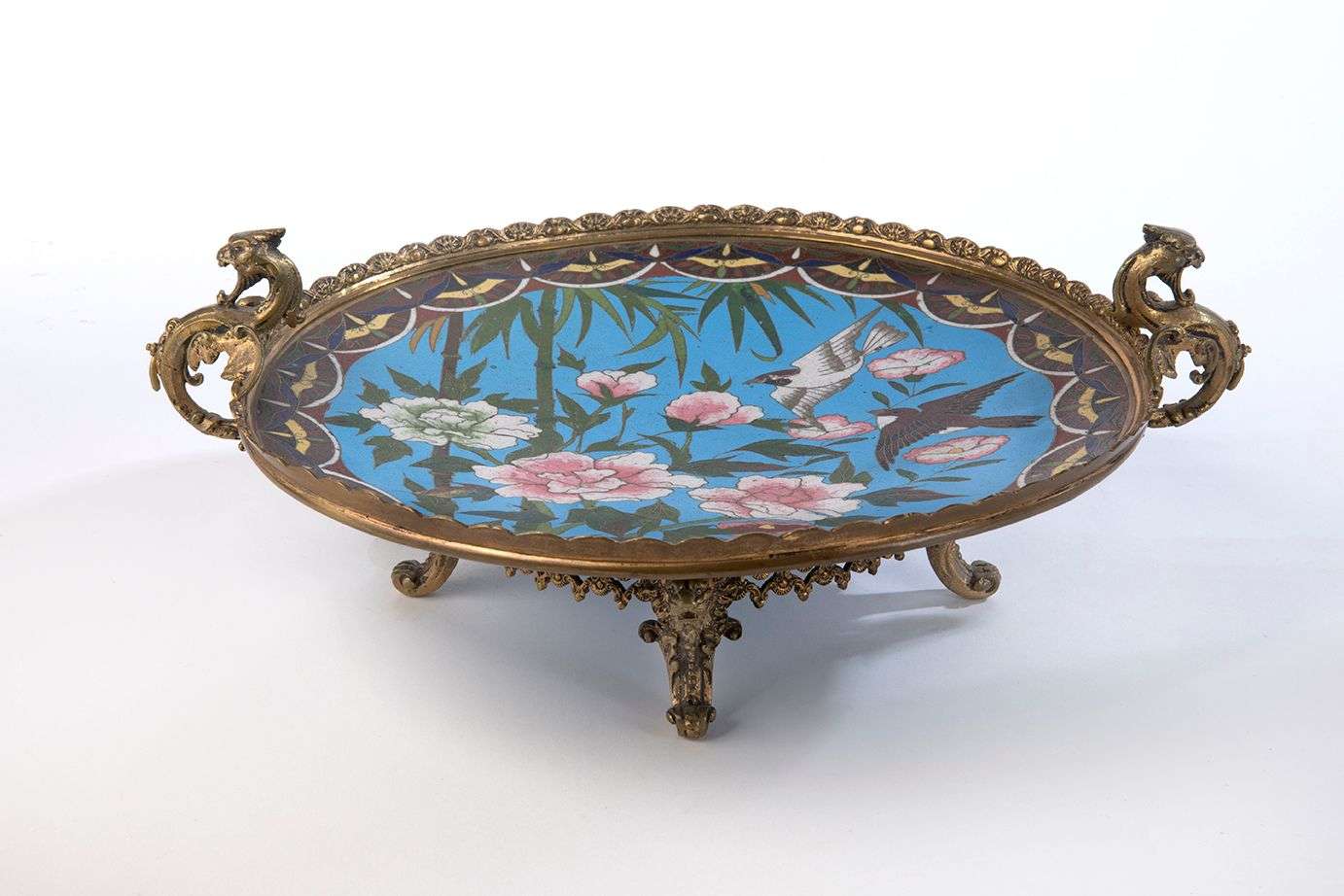 Le plat émaillé à décor de volatiles et pivoines dans le goût de la Chine, la monture en bronze doré ornée de muffles de lion.