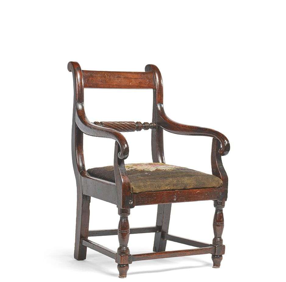 en bois teinté, le dossier ajouré et l'assise amovible.