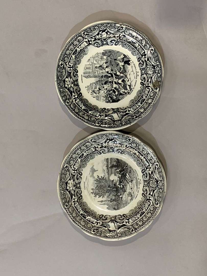 Deux assiettes circulaires en faïence à décor imprimé en grisaille de scènes sur la vie de Garibaldi.