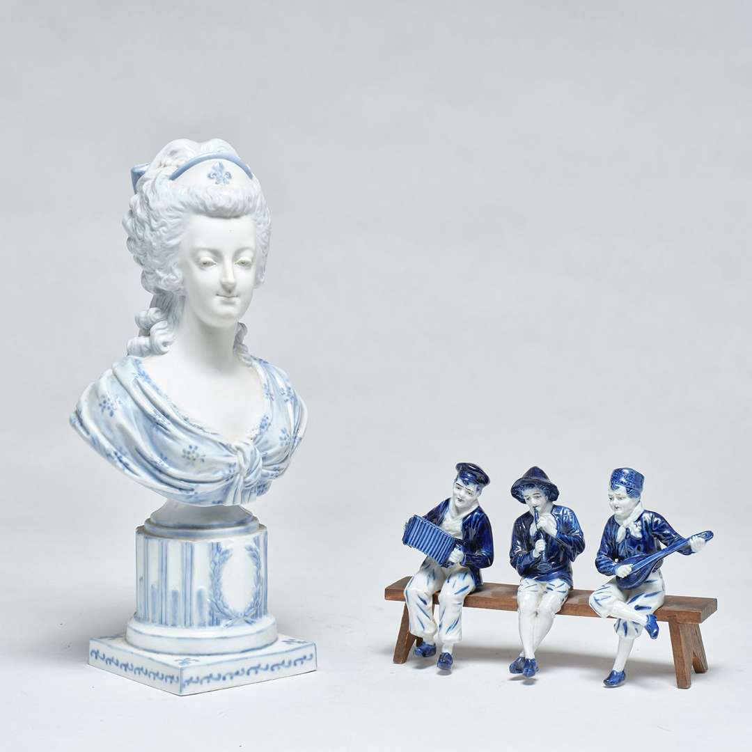 On y joint 3 sujets en porcelaine bleu-blanc figurant des musiciens sur un banc en bois. Hauteur : 14 cm