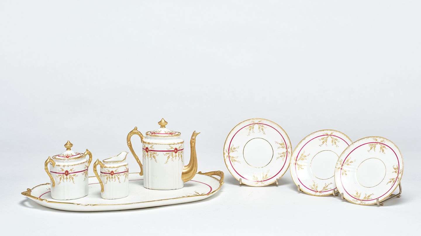 en porcelaine à liseré doré et décor polychrome et or comprenant :