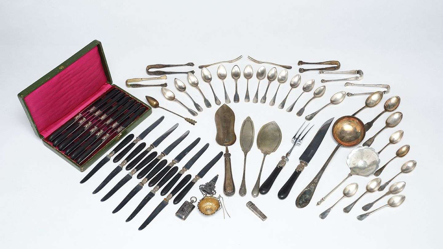 - une louche, quatre pelles, 5 pinces à sucre, un passe thé, une fourchette à escargot et 25 cuillères en métal argenté.