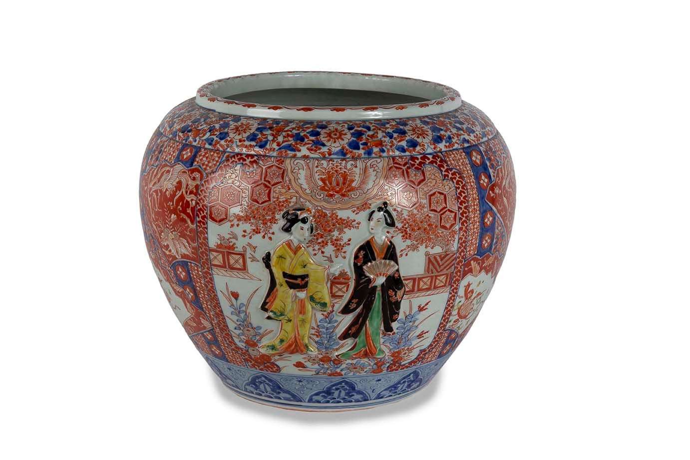 Vase guanyin en porcelaine de Canton décoré aux émaux polychromes, l'épaulement et le col agrémenté de chilong et de lions bouddhiques, la lèvre festonnée, la panse à décor de réserves animées de personnages dans des jardins.~