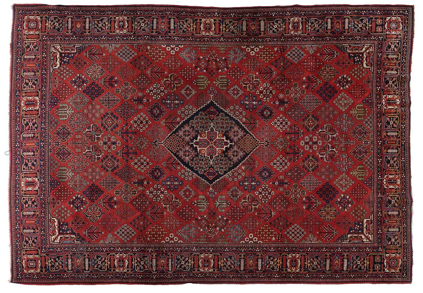 Velours de laine sur fondations en coton Bon état général Champ rouge brique à décor floral géométrique de semis de caissons floraux polychromes encadrant un médaillon central losangique bleu nuit Quatre écoinçons à décor rappelant le champ central
