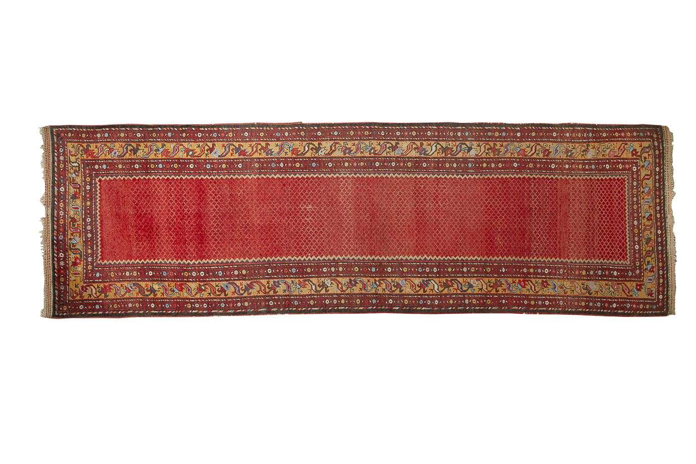 Velours de laine sur fondations en laine. Champ brique à décor de nids d'abeilles stylisés. Bordure principale jaune safran à original décor géométrique.